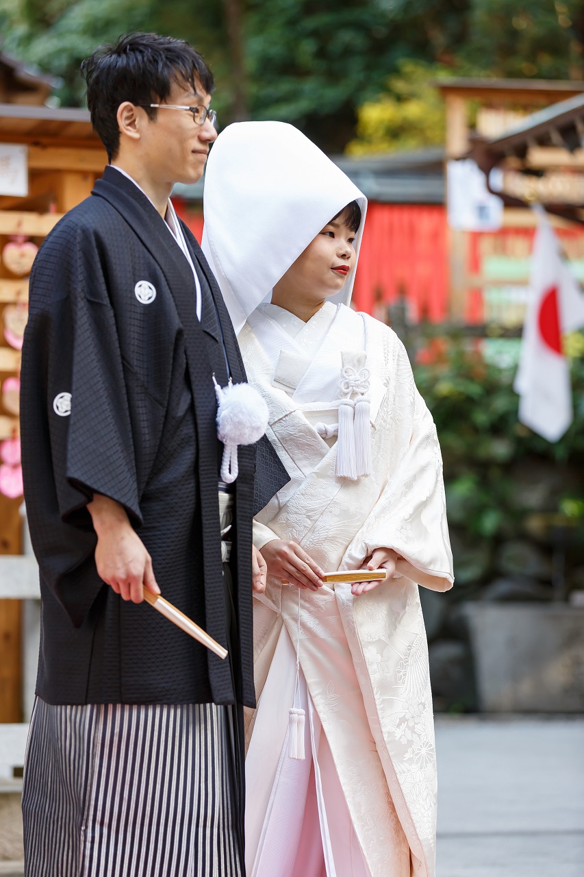 大阪府 枚岡神社挙式+衣装つき会食 白無垢(御所車飛鶴)+綿帽子+新日本髪 色打掛(源氏物語)