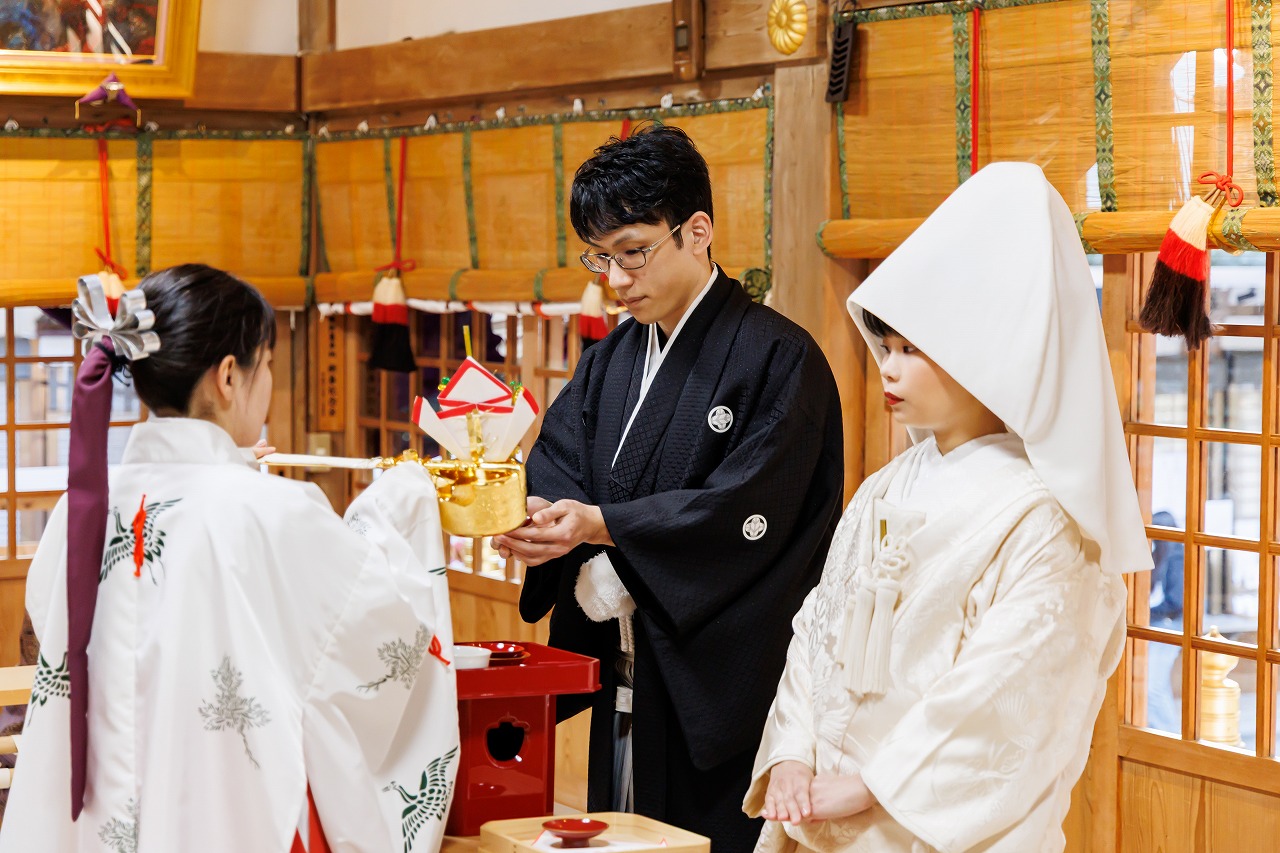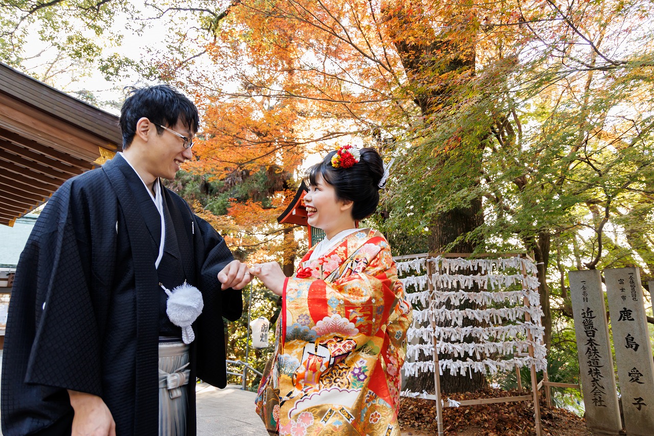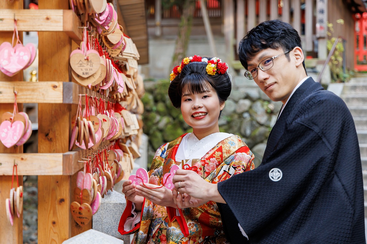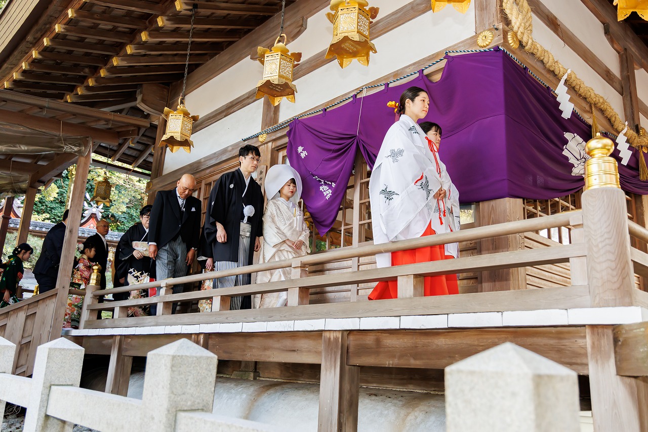 大阪府 枚岡神社挙式+衣装つき会食 白無垢(御所車飛鶴)+綿帽子+新日本髪 色打掛(源氏物語)  2025.12.13