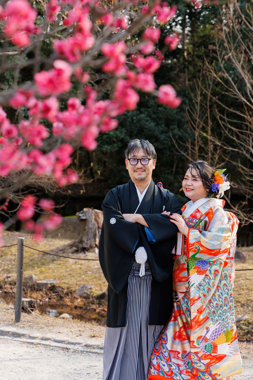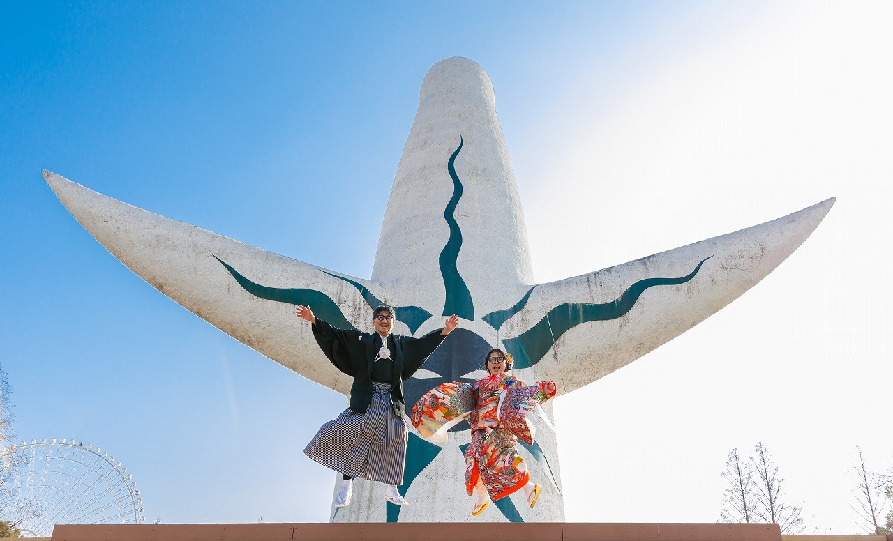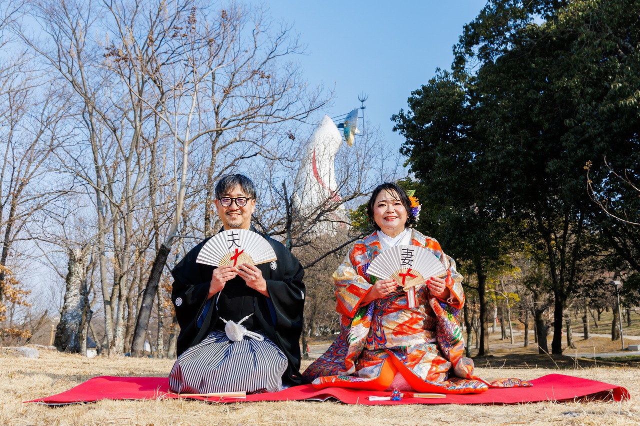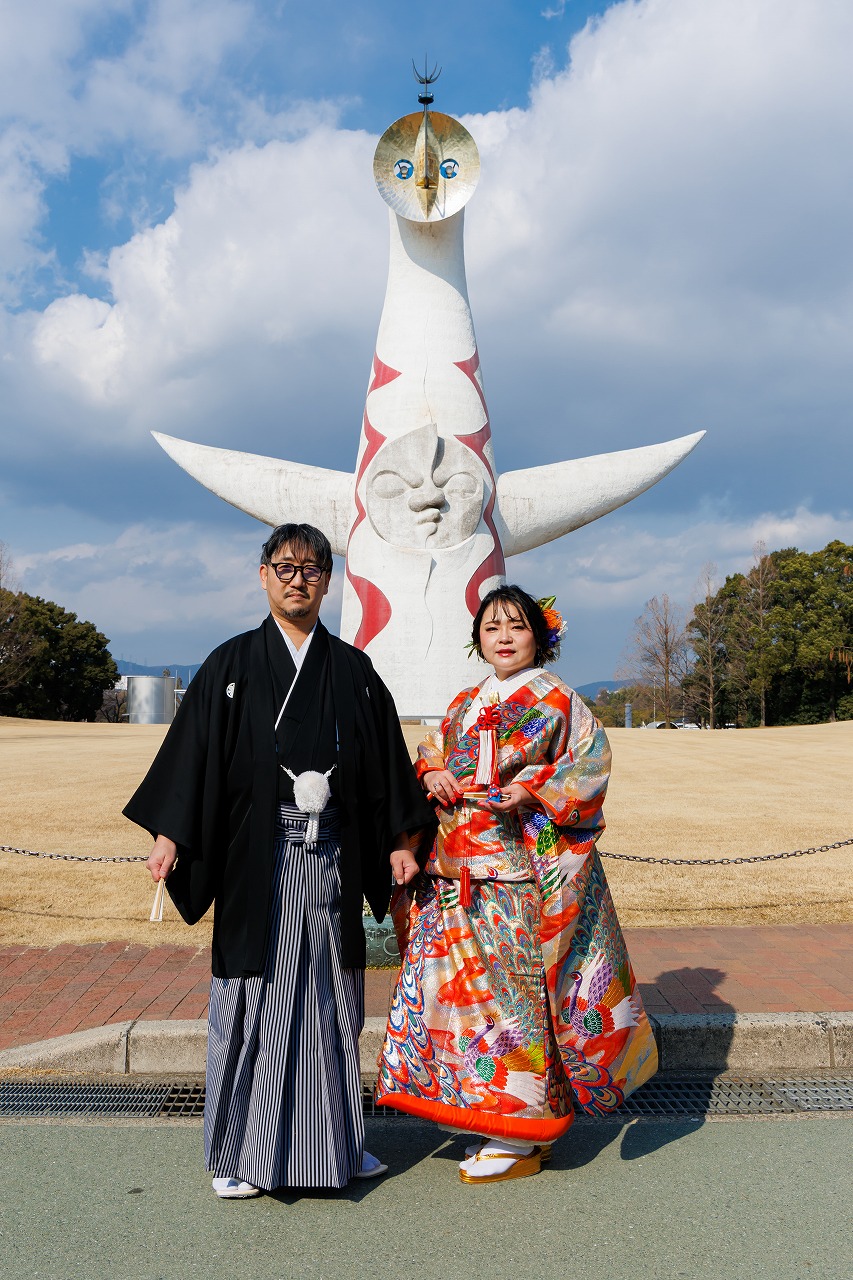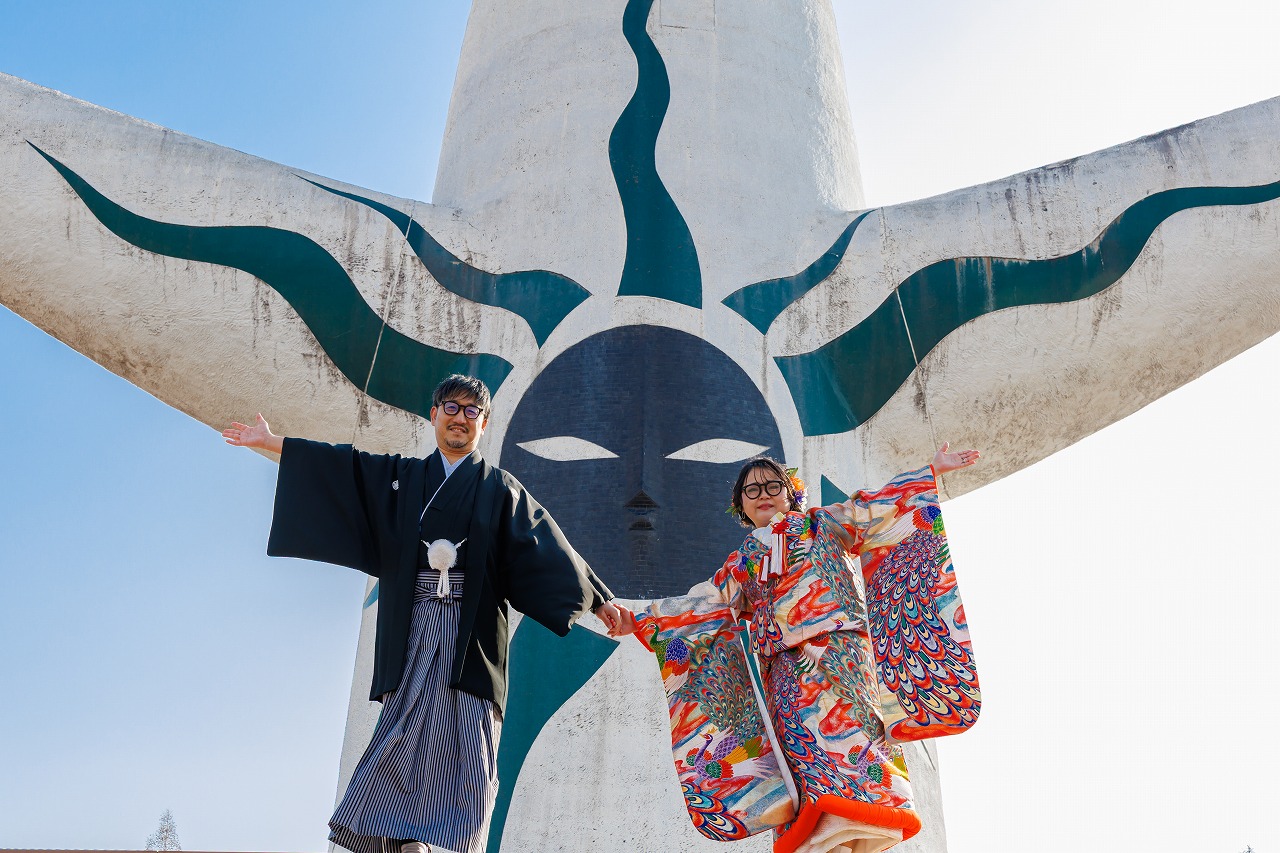 2026年02月02日 大阪府吹田市 万博記念公園フォトウエディング 色打掛(虹孔雀)ヘアメイク持込 大阪府吹田市 万博記念公園フォトウエディング 色打掛(虹孔雀)ヘアメイク持込 2026.2.2 新旧のコラボ撮影 笑顔がキュートな新婦様 お二人の大ジャンプ