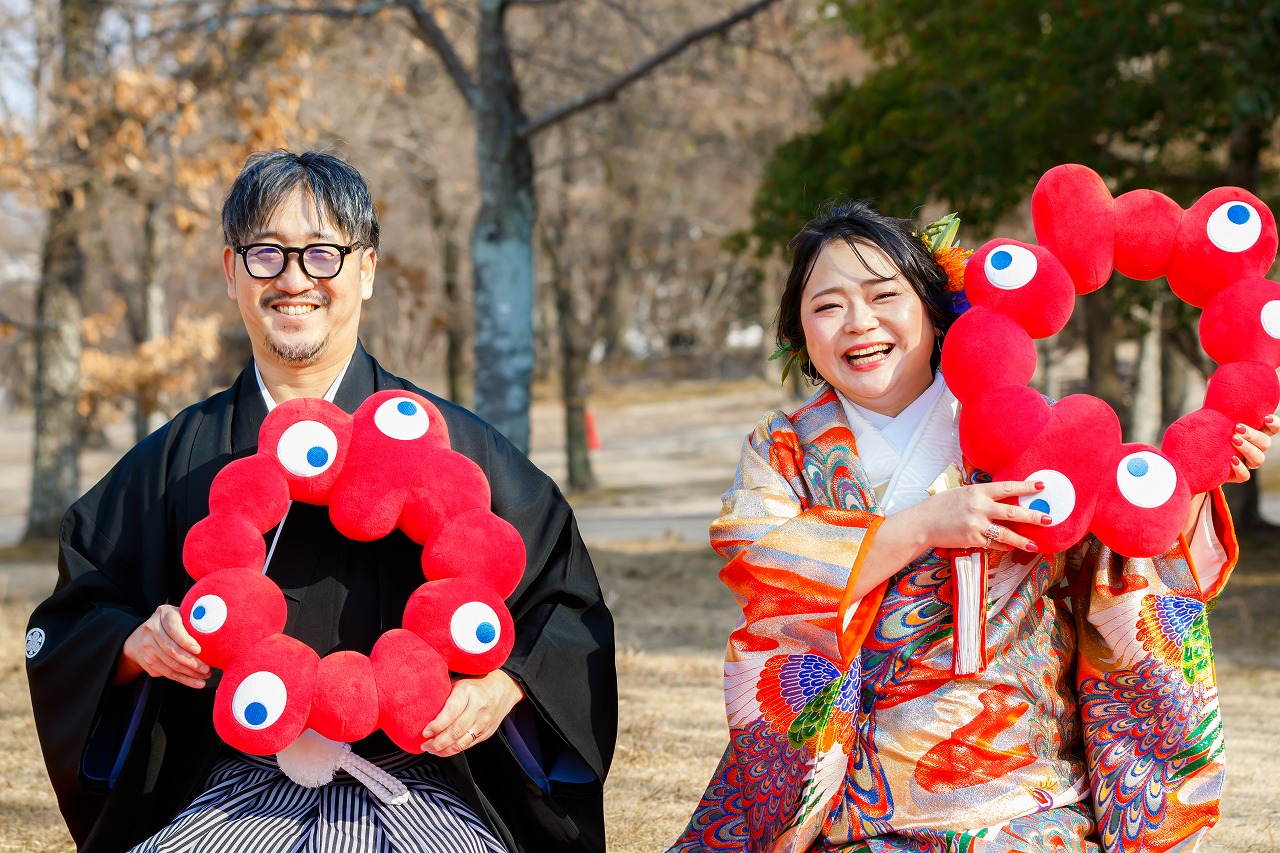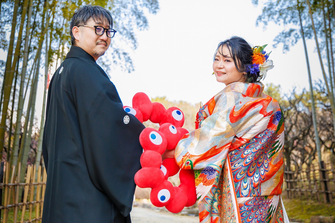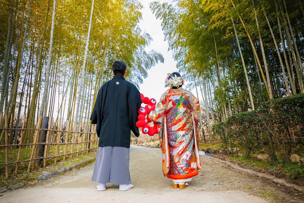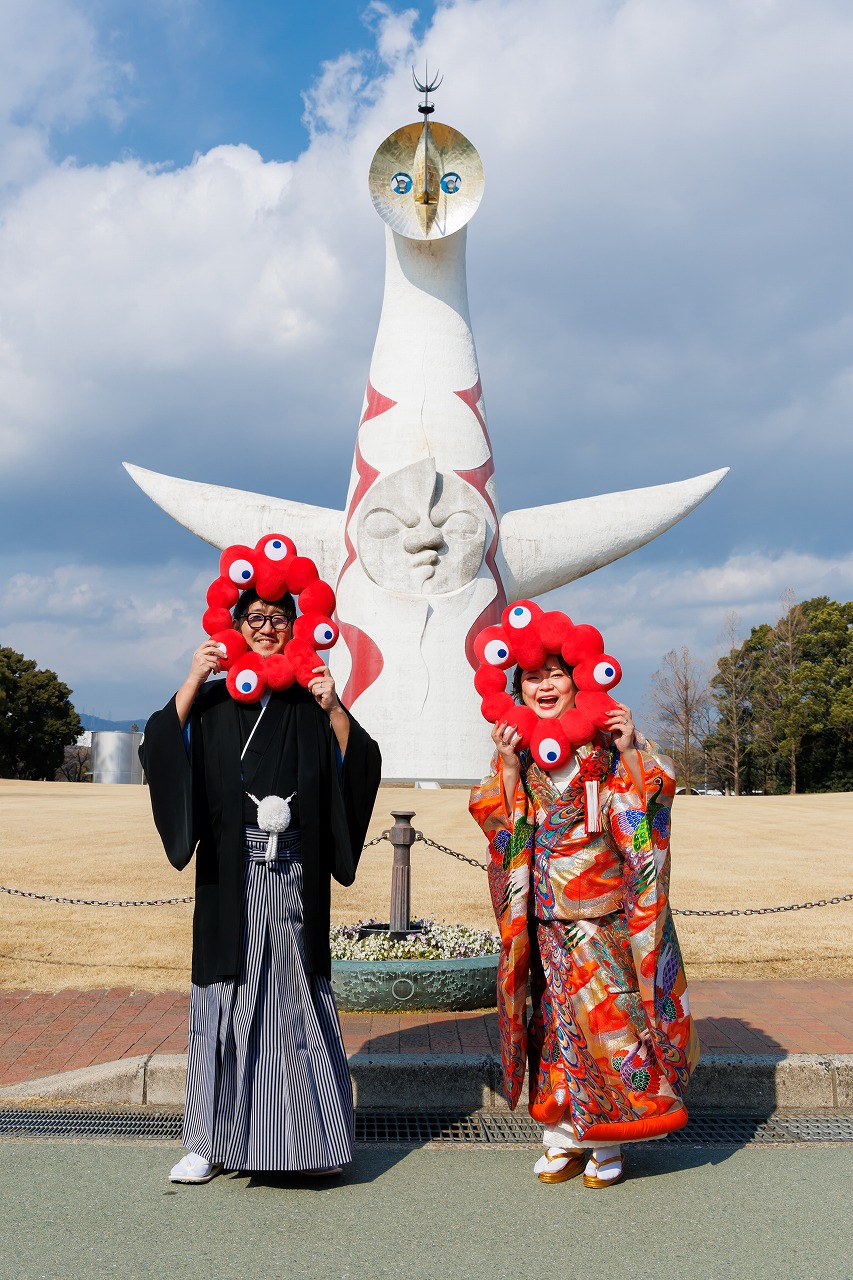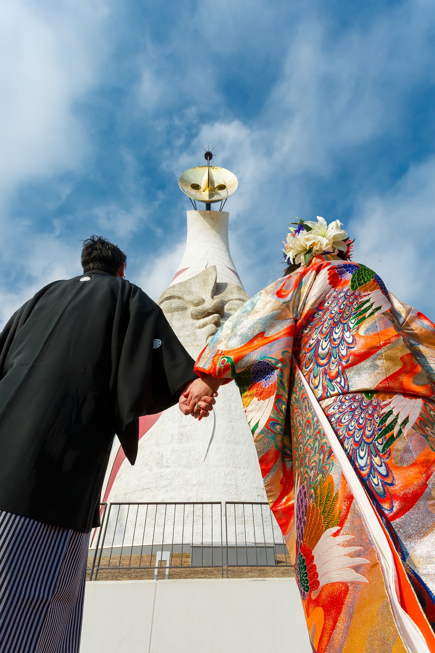 2026年02月02日 大阪府吹田市 万博記念公園フォトウエディング 色打掛(虹孔雀)ヘアメイク持込 大阪府吹田市 万博記念公園フォトウエディング 色打掛(虹孔雀)ヘアメイク持込 2026.2.2 新旧のコラボ撮影 笑顔がキュートな新婦様 お二人の大ジャンプ