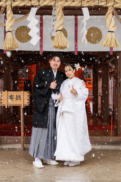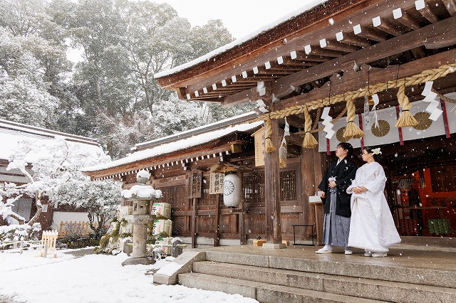 2026年02月08日 京都府 出雲大神宮 白無垢(晶鶴)+洋髪 色打掛(オーロラ) 京都府 出雲大神宮 白無垢(晶鶴)+洋髪 色打掛(オーロラ) 2026.2.8 大雪の日でしたが無事に挙式を挙行することができました。 吹雪の中の新郎新婦様も素敵ですね